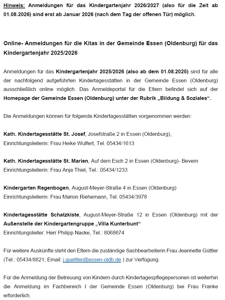 Für weitere Auskünfte steht den Eltern die zuständige Sachbearbeiterin Frau Jeannette Güttler (Tel.: 05434/8821; Email: j.guettler@essen-oldb.de ) zur Verfügung.